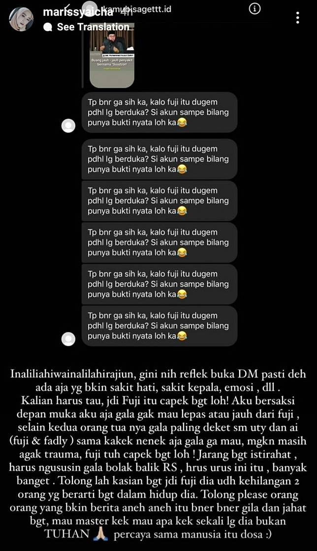 Marissya Icha terkejut mendapati ada pertanyaan semacam itu di DM Instagramnya. Tidak mengiyakan ataupun membantah, Marissya Icha mengurai betapa capeknya Fuji semenjak terjadi musibah yang menewaskan kakak dan kakak iparnya.
