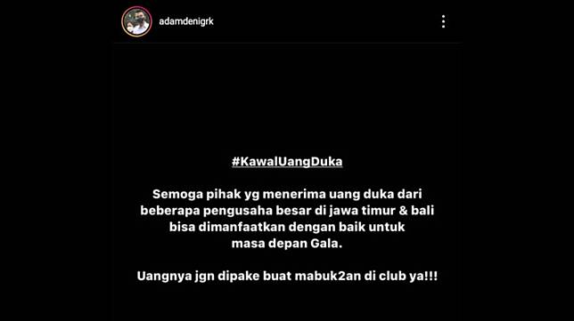 “#KawalUangDuka, semoga pihak yang menerima uang duka dari beberapa pengusaha besar di Jawa Timur & Bali bisa dimanfaatkan dengan baik untuk masa depan Gala. Uangnya jgn dipake buat mabuk2an di club ya!,” tulis Adam Deni dilansir IntipSeleb pada Instagram @adamdenigrk.