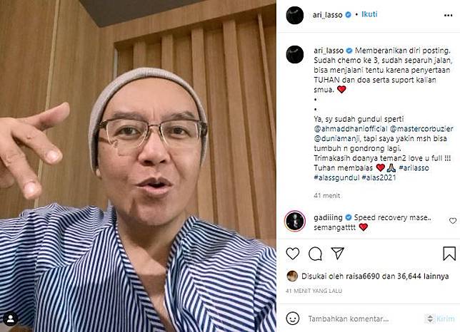 "Memberanikan diri posting. Sudah chemo ke 3," ujar Ari Lasso dikutip Grid.ID, Selasa (16/11/2021)."Sudah separuh jalan bisa menjalani tentu karena penyertaan TUHAN dan doa serta support kalian semua," imbuhnya.Menjalankan kemoterapi ke-3 kalinya, potret yang dibagikan Ari Lasso dinilai netizen cukup memprihatinkan.Tampak pucat dan kurus, Ari Lasso mengaku saat ini rambutnya telah rontok dan botak."Ya, saya sudah gundul seperti @ahmaddhaniofficial @mastercorbuzier @duniamanji.""Tapi saya yakin masih bisa tumbuh n gondrong lagi.""Terimakasih doanya teman2 love u full !!! Tuhan membalas," ujar Ari Lasso.
