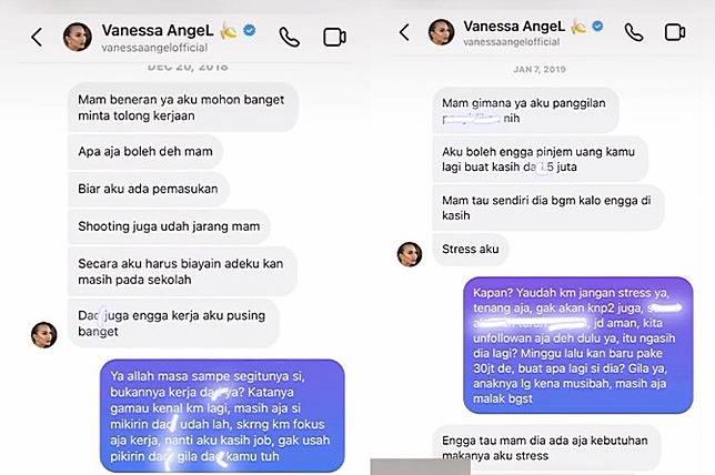 “Mam beneran ya aku mohon banget minta tolong kerjaan. Apa aja boleh deh mam. Biar aku ada pemasukan. Shooting juga udah jarang mam. Secara aku harus biayain adikku kan masih pada sekolah. Dan juga nggak kerja aku pusing banget,” tampak isi DM chat Vanessa Angel.