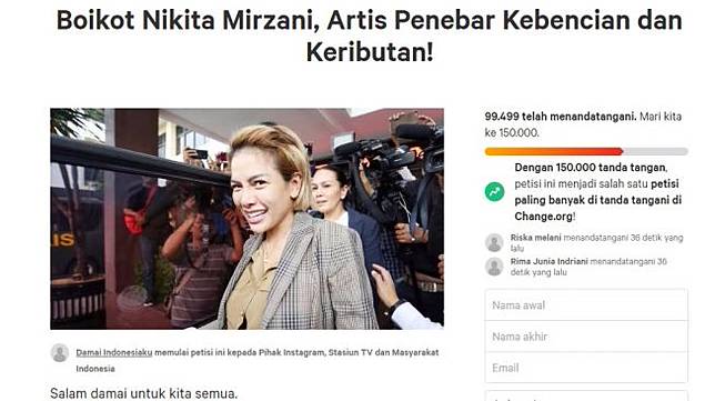 Sebagaimana diketahui, petisi memboikot Nikita Mirzani dari televisi saat ini sedang ramai di media sosial. Dicetuskan pemilik akun bernama Damai Indonesiaku, petisi lahir akibat sikap Nikita yang dianggap sering menebar kebencian.