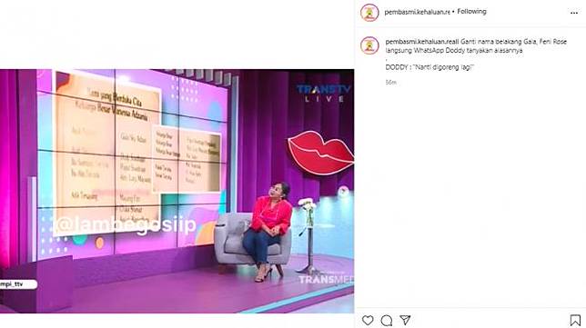 Feni Rose, pembawa acara Rumpi No Secret ikut geram dan melempar sentilan pedas kepada Doddy. Terlihat dalam cuplikan video yang dibagikan akun IG @pembasmi.kehaluan.reall, Feni mempertanyakan maksud Doddy mengganti nama belakang cucunya.