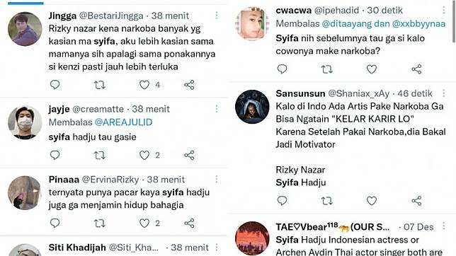 “Syifa nih sebelumnya tau gak sih kalau cowoknya make narkoba?” kata warganet di Twitter.