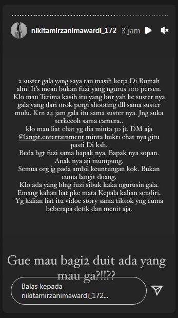 "Dua suster Gala yang saya tahu masih kerja di rumah almarhum. Its mean bukan Fuji yang ngurus 100 persen," terang Nikita Mirzani.