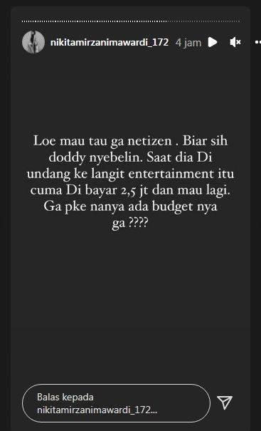"Lo mau tahu nggak netizen. Biar si Doddy nyebelin. Saat dia diundang ke Langit Entertainment itu cuma dibayar Rp 2,5 juta dan mau lagi. Nggak pake nanya ada budget-nya nggak," kata Nikita Mirzani di Instagram Story pada Kamis (9/12/2021).